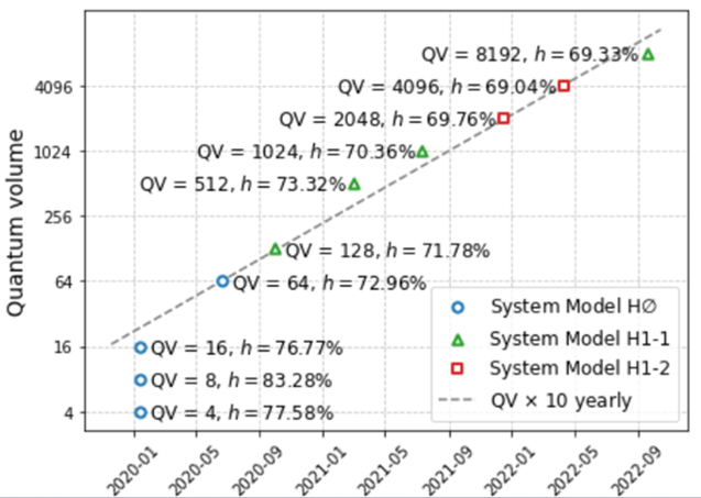 QV Progression at Quantinuum Showing Quantum Volume (QV) and Heavy Output Outcome Percents (h). Credit: Quantinuum